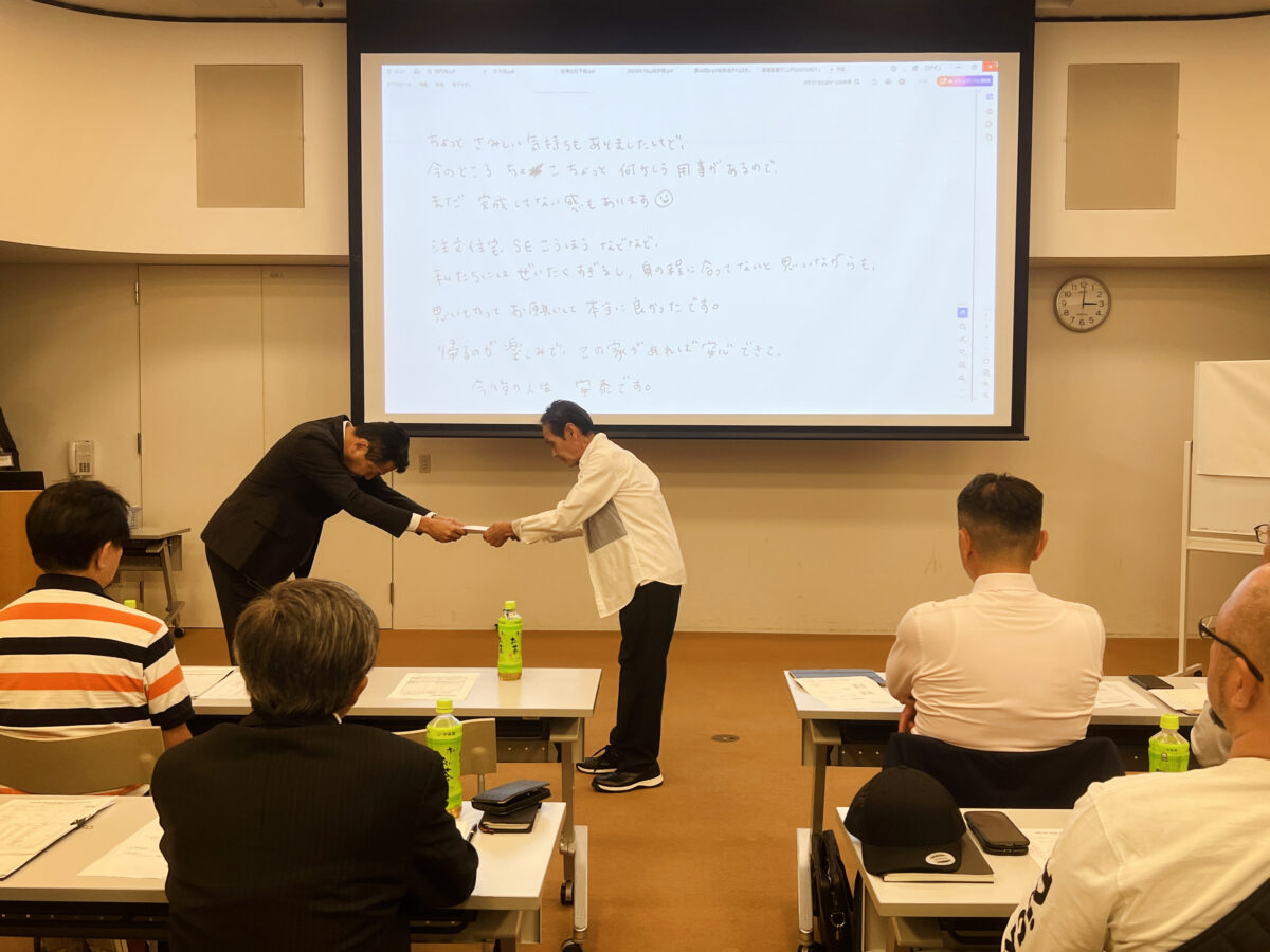 今年度ご自宅を建てられ、また弊社の業績向上に多大なご尽力をいただいた施主様に対し、感謝の意を込めて表彰を行いました。