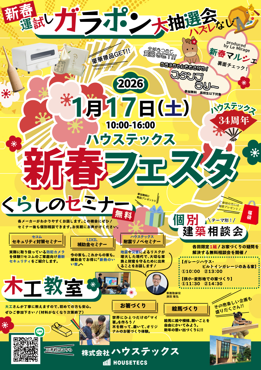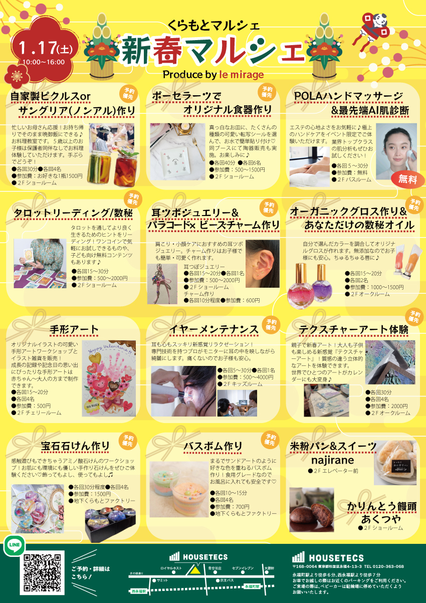 今年も「ハウステックス新春フェスタ」開催します! Le Mirageがプロデュースの「新春マルシェ」も楽しい企画が盛りだくさん! お楽しみに。 (内容は予告なく変更することがございますのでご了承ください)