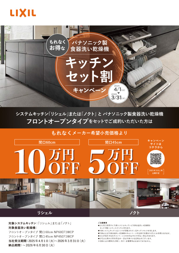 パナソニック製フロントオープンタイプの食器洗い乾燥機と、LIXILのシステムキッチン「リシェル」または「ノクト」をセットでご契約いただくと、もれなくメーカー希望小売価格より大幅割引に!