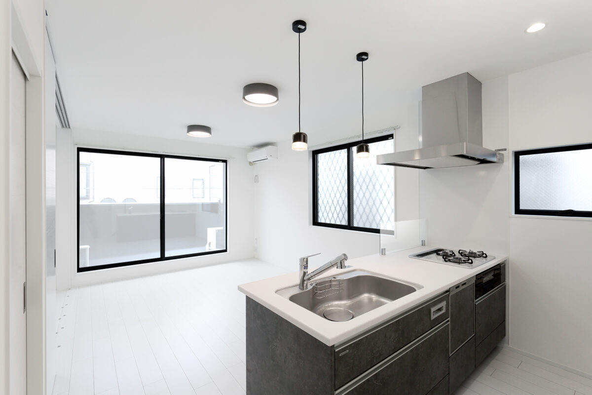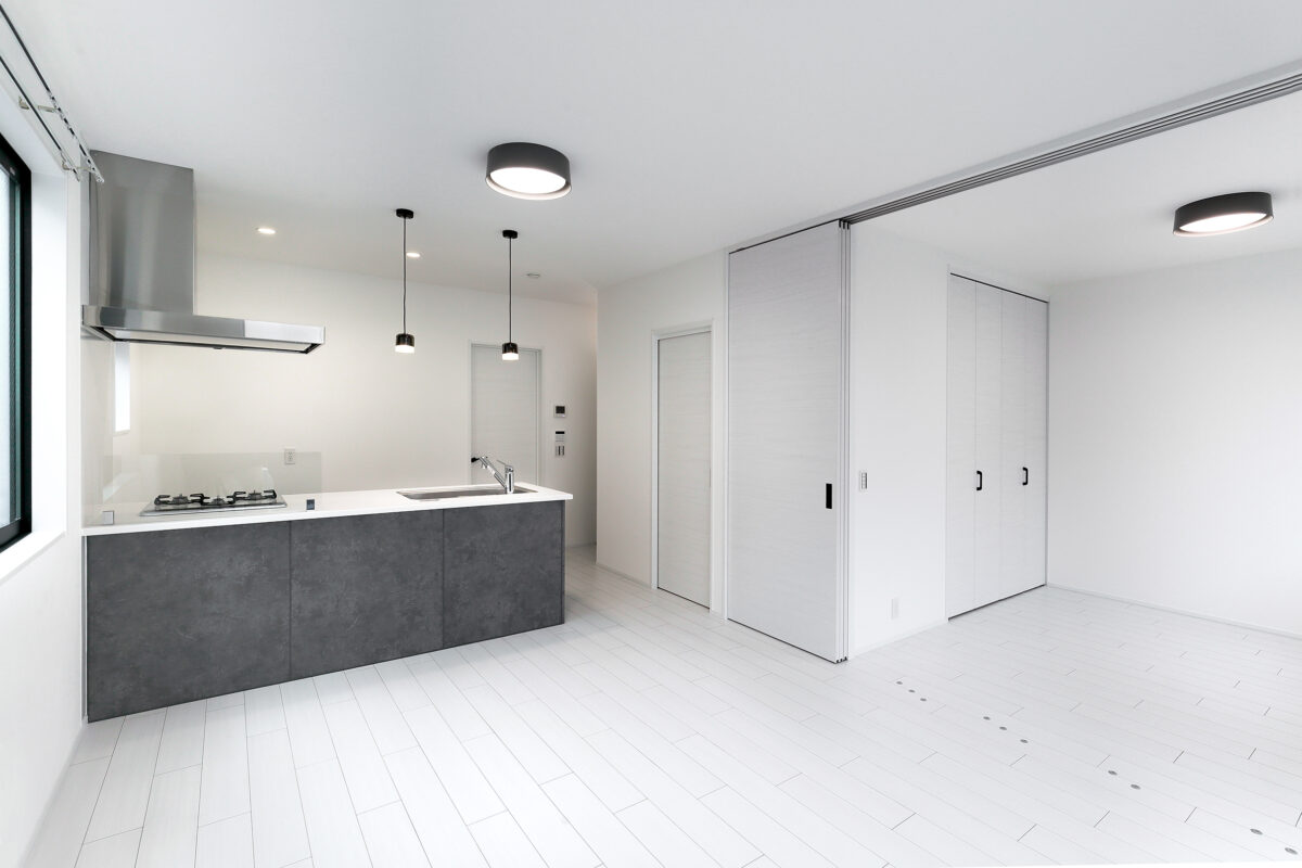 シャープな外観デザインと、白を基調とした洗練された室内が魅力のメゾネット賃貸。玄関から住空間まで、細部にこだわった設計です。