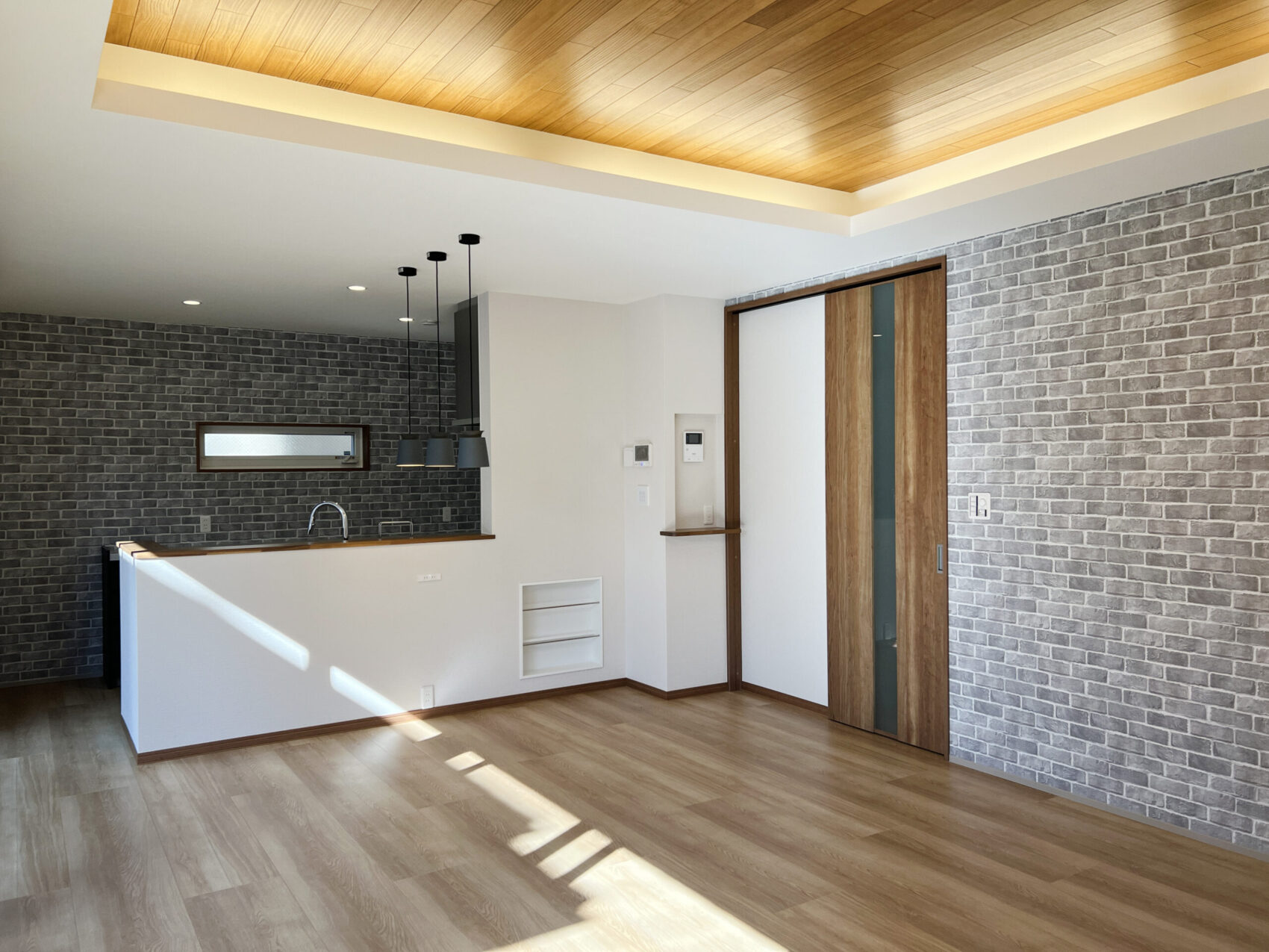 天井を一段上げて、板張り仕上げに。 間接照明のやわらかな光が、上質な空間を演出。