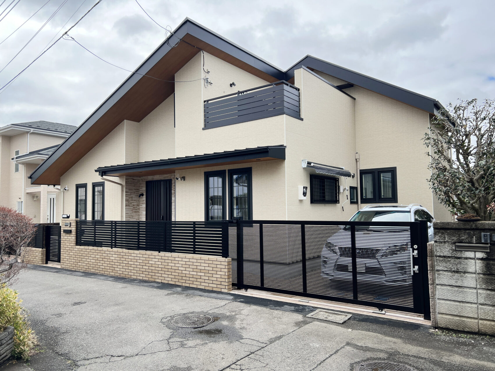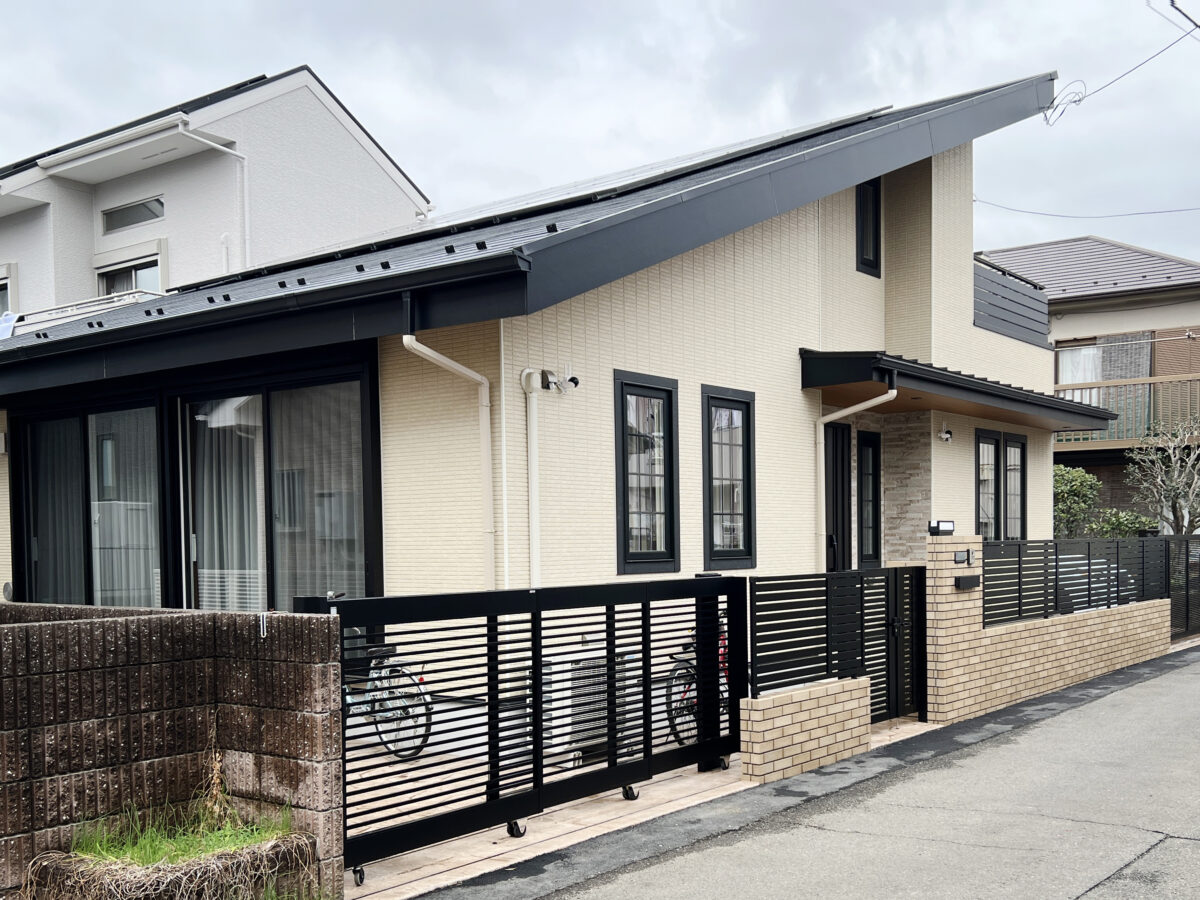 淡いベージュと黒を組み合わせた、上質で落ち着きのある外観デザイン。 2階建てながら、片流れ屋根とボリューム構成で平屋に近い低重心な佇まいを実現。