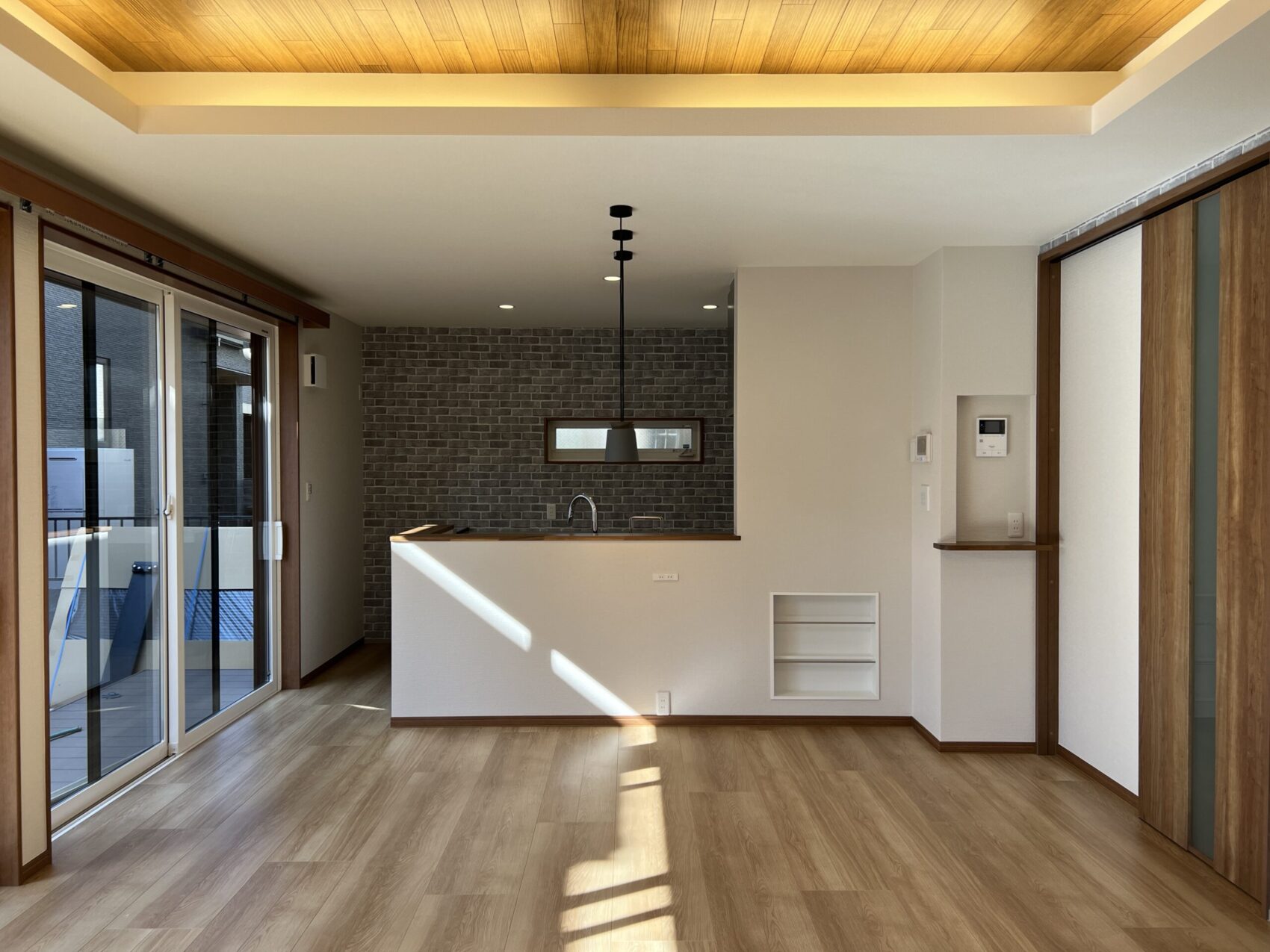 大きなガラス戸から自然光がたっぷり入るLDK。床はオーク材を使用し、ナチュラルで温かみのある印象に。