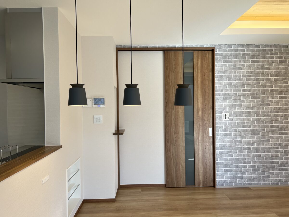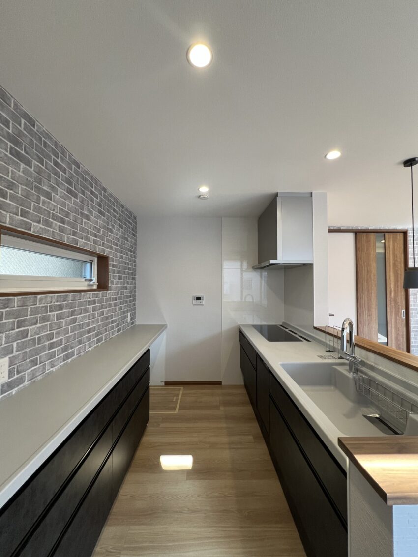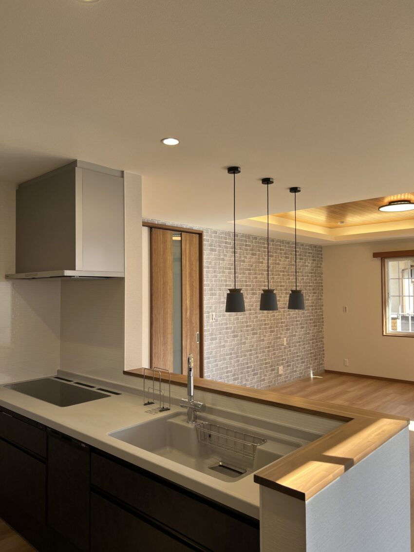 家族とコミュニケーションが取りやすいペニンシュラキッチン。配膳や片付けもしやすい動線を意識したプラン。