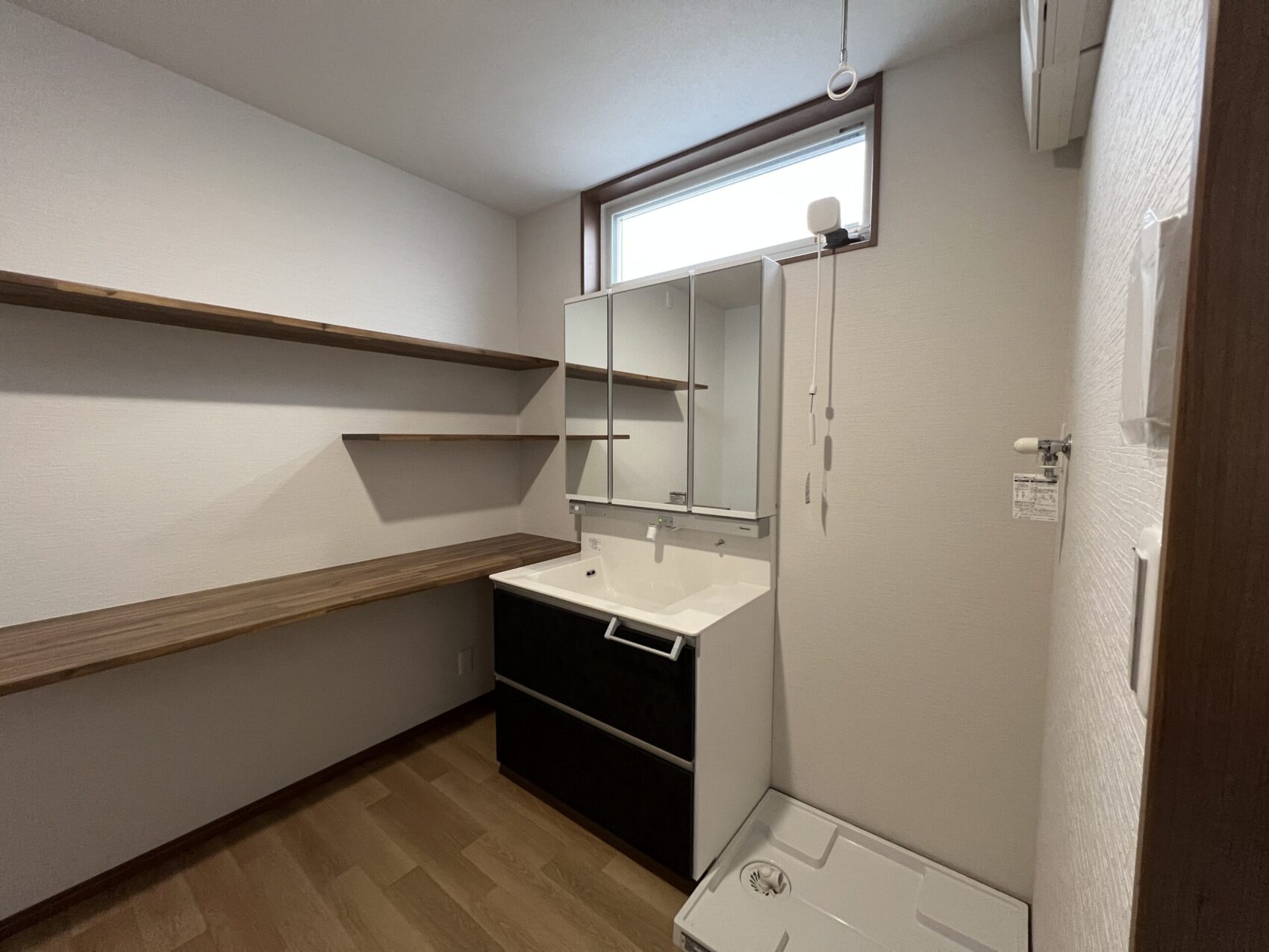 横いっぱいに設けた木製のオープン棚。 タオルやストック類、インテリア小物などを置き「見せる収納」として、使い勝手とデザイン性を両立。