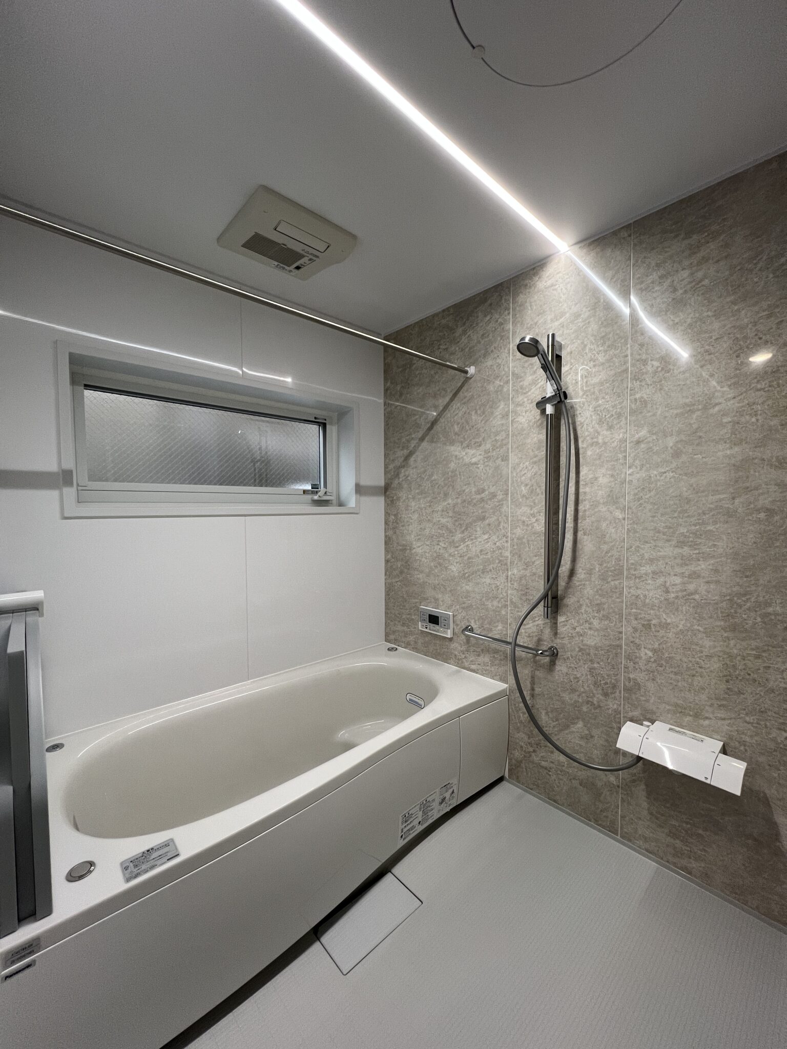1.25坪のゆとりあるバスルーム。壁には大理石調のパネルを採用し、高級感と落ち着きを両立。