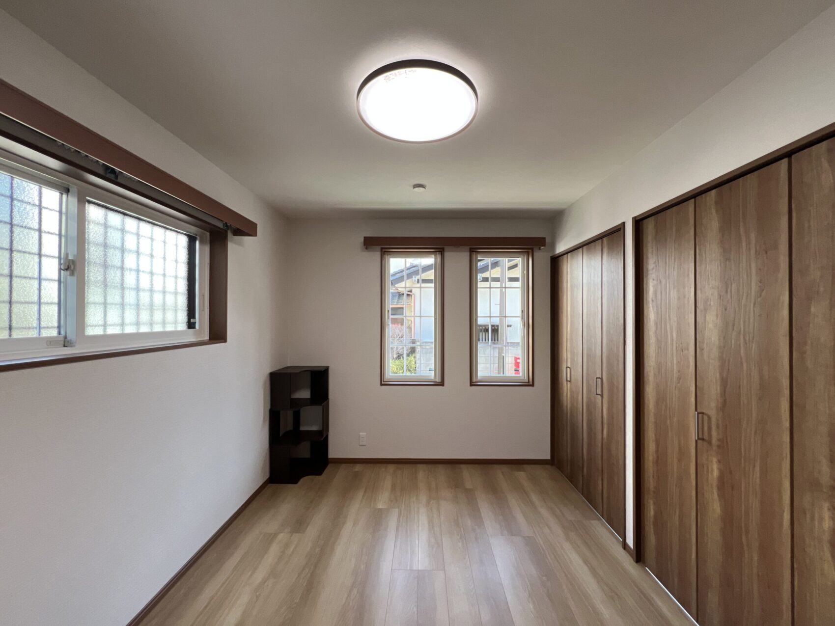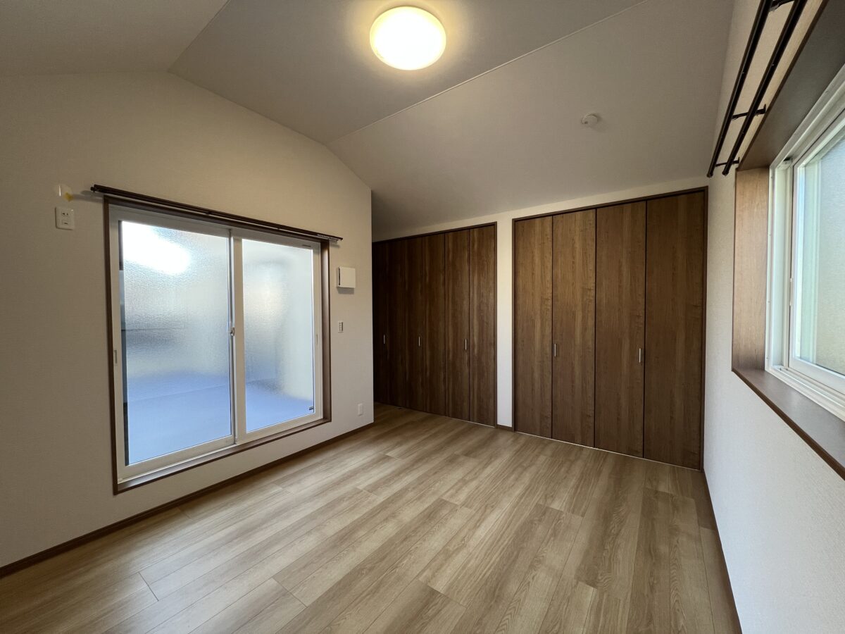 窓から自然光が差し込む、心地よい洋室。一角には、大きな木目調扉のウォークインクローゼットを設置し、季節ごとの衣類や小物類まで、ひとまとめに収納。